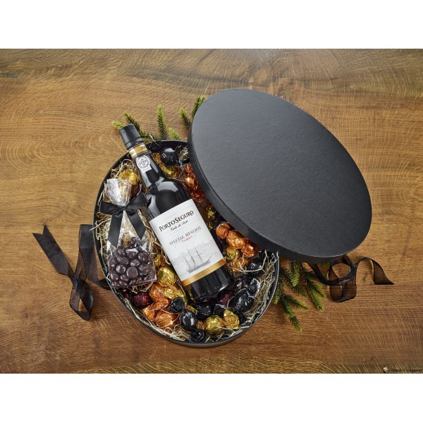 Pakket i sort hatteæske m/sløjfe