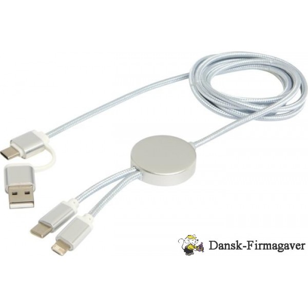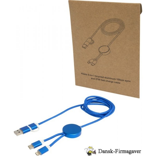 Dette Alasia kabel med 5-i-1 datasynkronisering og 27 W hurtigopladning er fremstillet af elegant og holdbart genvundet aluminium og genvundet plast. Kablet har et USB-A og et Type-C indgangsstik kombineret med et Type-C og et Lightning/Micro USB-kombi-udgangsstik. USB-A til USB-C giver en effekt på max 27W, og alle andre tilslutningsmuligheder har et max på 15W. Kompatibel med CarPlay og Android Auto. Uanset om du er derhjemme, på kontoret eller på farten, byder Alasia kablet på ydeevne og stil i én kompakt pakke. Kabellængde: 150 cm. Recycled aluminium.