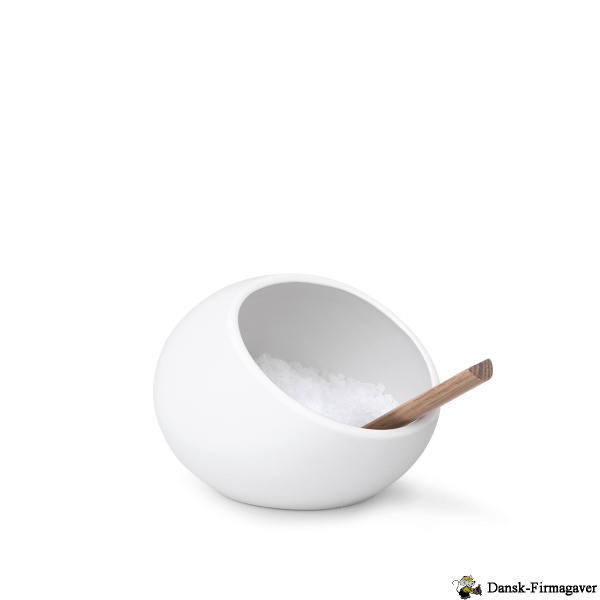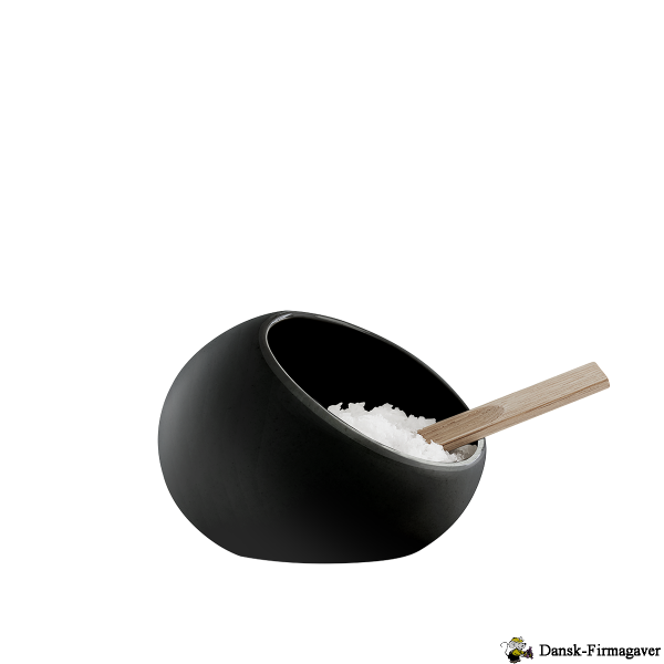 Dette saltkar er lavet af porcelæn og har en medfølgende ske i egetræ. Saltkarret har en mat glasur udvendigt og er blankt glaseret indvendigt. Det giver et unikt udtryk, og gør den let at rengøre i opvaskemaskinen. Det runde formsprog, sammen med den sorte farve og egetræsskeen, skaber et enkelt og nordisk udtryk. Stil saltkarret i køkkenet eller på spisebordet. Kan også bruges til tørrede laurbærblade eller friske krydderier.