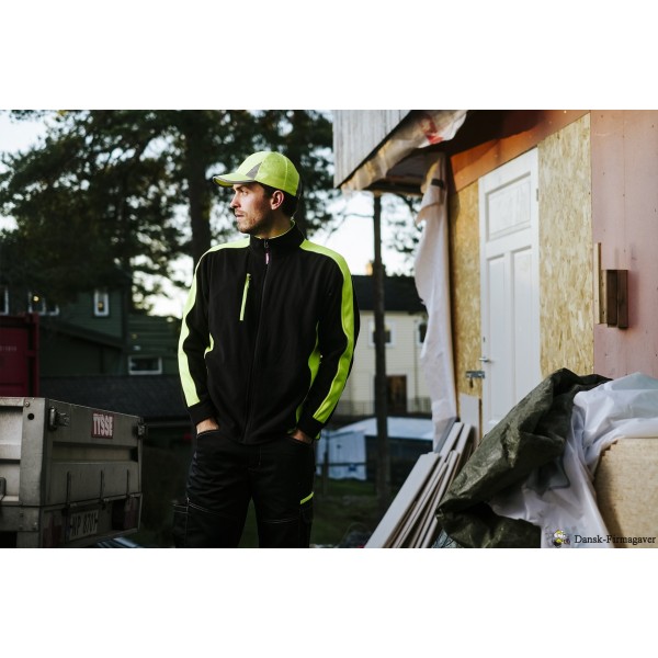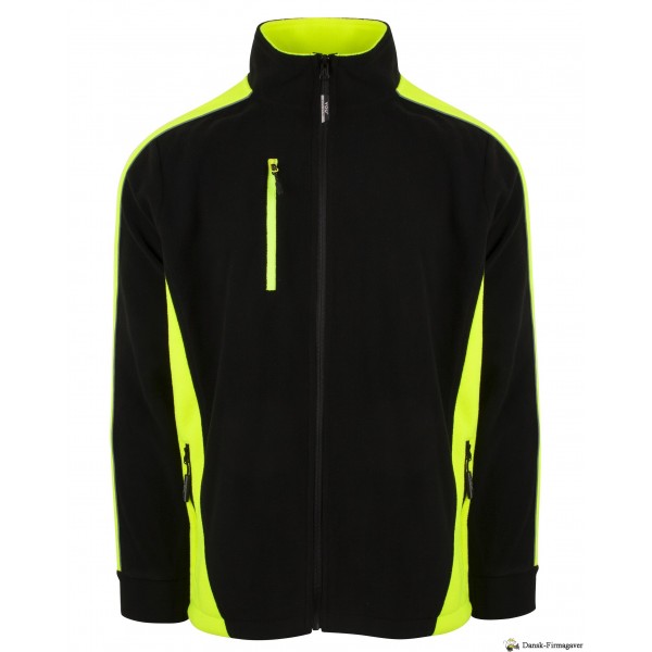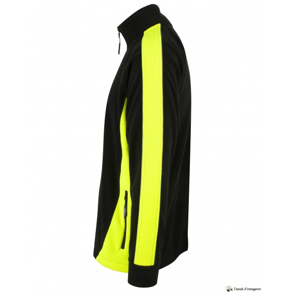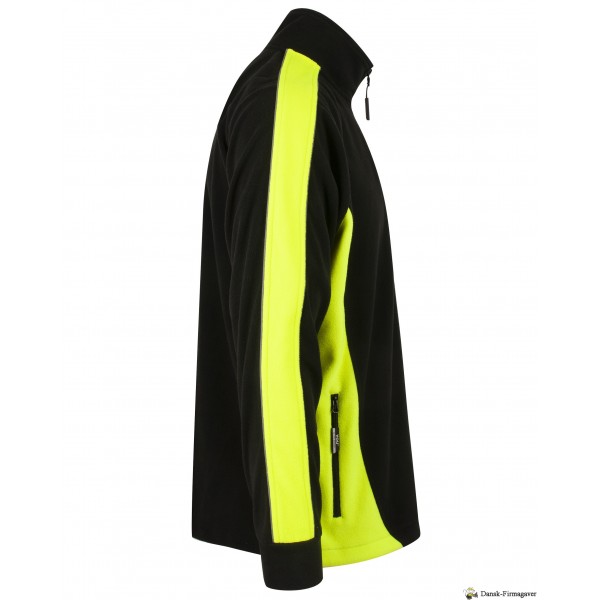 Ekstremt holdbar unisex PRO arbejdsjakke i fleece i 100% genanvendt polyester. Klassiske snit- og safety gule kontrastfelter i siderne og over skuldrene/ærmerne. Brystlomme og sidelommer med lynlås.