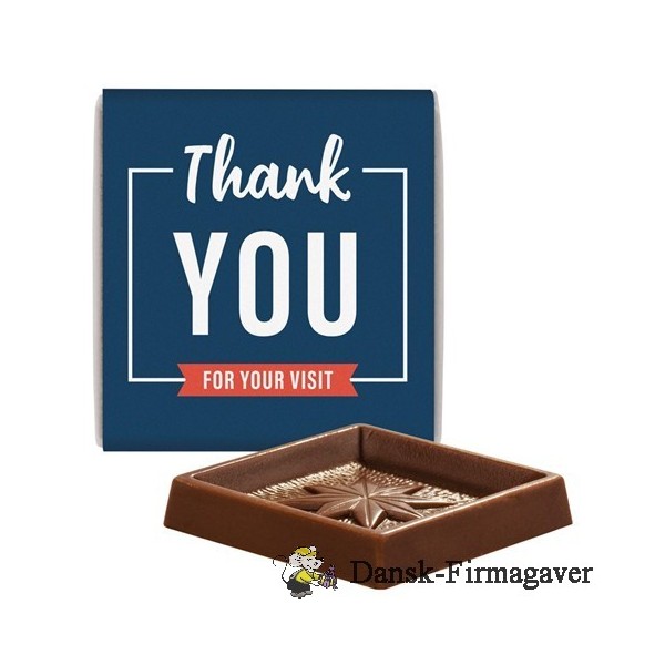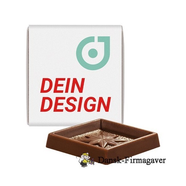 Firkantede og praktiske på samme tid: Lækre firkantede chokoladebarer lavet af alpemælkechokolade i Fairtrade-kvalitet. Det halvtransparente pergamentpapirindpakning giver en velsmagende smagsprøve på den søde reklameartikel indeni. Takket være et specialtrykt papirbånd står intet i vejen for et dejligt reklamebudskab.