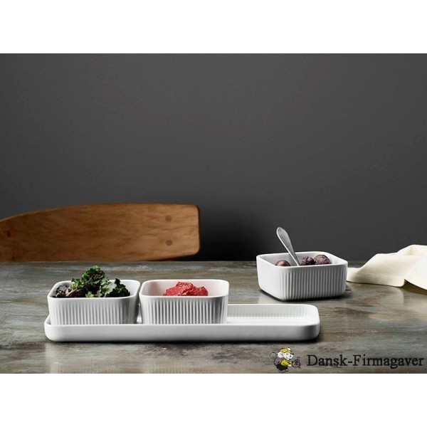 Elegant og tidsløst serveringsfad og skåle, som fremhæver enhver anretning. Fadet pynter på gæstebordet og er samtidig skabt til brug i hverdagen, fordi det er fremstillet i porcelæn af høj kvalitet, som gør det slidstærkt i brug. Med det elegante rillede design på ydersiden kan det også bruges til dekoration alene eller til frugt. Alle dele tåler både ovn, mikroovn, fryser og maskinopvask.