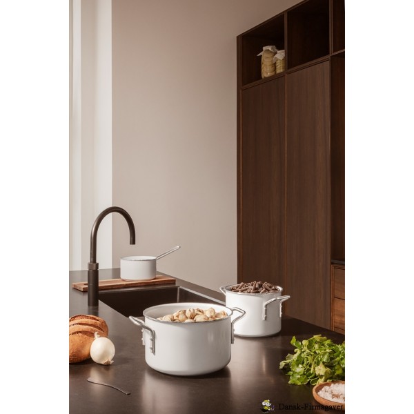 Meget anvendelig gryde, der fås i fire størrelser. Den keramiske belægning er hård og robust og vil bevarer sin hvide farve uanset, hvilken form for madlavning, der laves. Nem at rengøre.