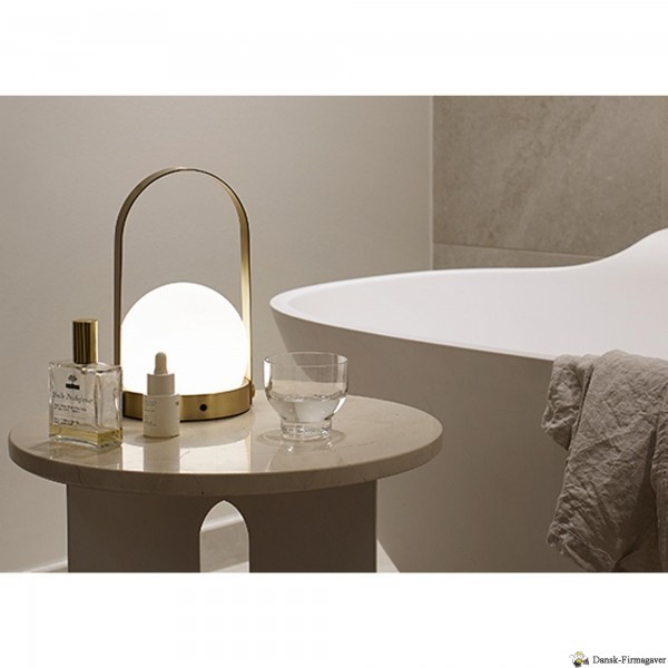 Carrie Table Lamp, portable fra MENU. Denne bærbare bordlampe ses som en minimalistisk innovation for frihed og feksibilitet. Bordlampen er opbygget med en base af metal eller plastik og en glasskærm som er unik for sine mange anvendelsesmuligheder. Lampen er lavet me det magnetisk stik i bunden til en nem opladning.