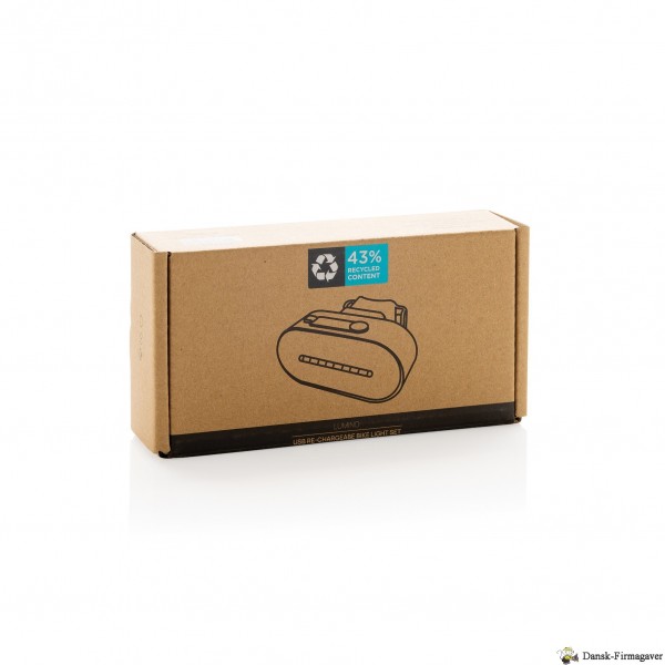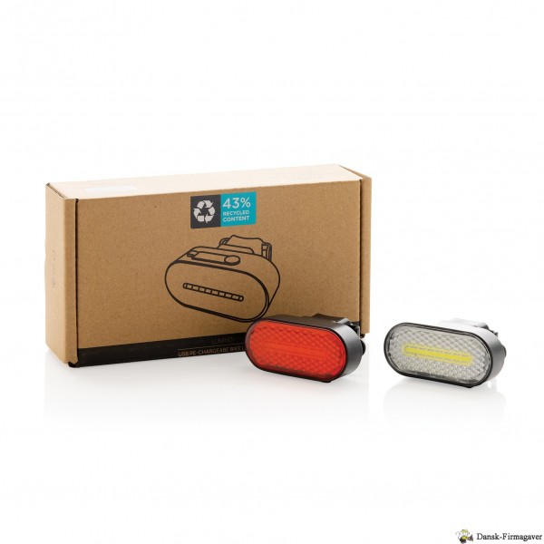 USB genopladeligt sæt cykellygter foran og bagpå lavet med RCS-genanvendt ABS. 1W lyset understøtter op til 2,5 timers brug på en enkelt opladning. Når den er opbrugt, kan den nemt genoplades via type C-indgang inden for 1 time. Med 400 mAh batteri. Cykellygten har 5 lystilstande (Stærk, medium, langsomt blinkende, hurtigt blinkende og pulserende) Med 60 lumen lys for optimal synlighed. Pakket i en plastfri FSC blandingsboks. Samlet genbrugsindhold: 43 % baseret på varens samlede vægt. RCS-certificering sikrer en fuldstændig certificeret forsyningskæde af de genbrugsmaterialer. PVC fri. Inklusiv genbrugt TPE type C ladekabel. IPX 4 vandtæt.