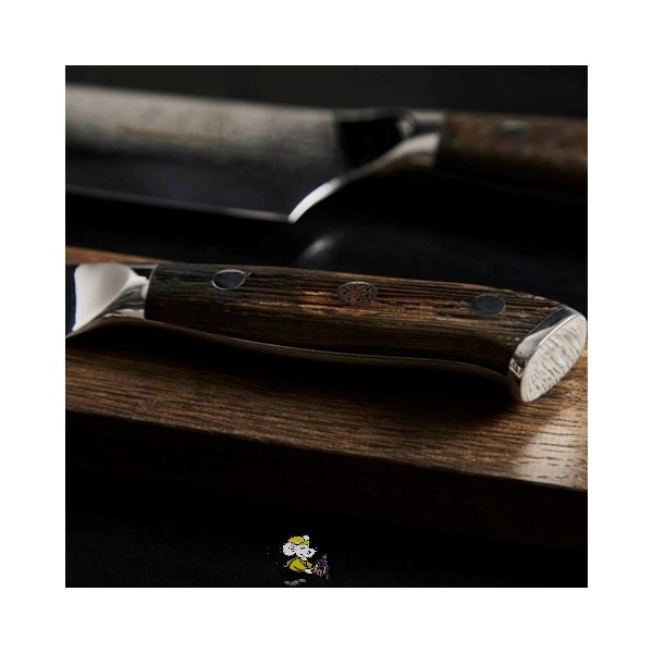 Med en hårdhed på 59–60 HRC overgår kniven standardkøkkenknive markant og holder skarpheden i lang tid. Håndtaget i eksklusivt Wengé-træ er formgivet til at ligge behageligt i hånden, hvilket gør kniven velegnet til længere tids brug uden at gå på kompromis med komforten.