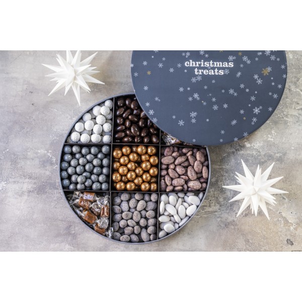 Lækker gaveæske med masser af lækkerier til at dele. Sprøde kiksekugler med chokolade, snebolde, karamellakridser, nougatmandler, dronningemandler, solbærmandler, smørbløde karameller og orangemandler.