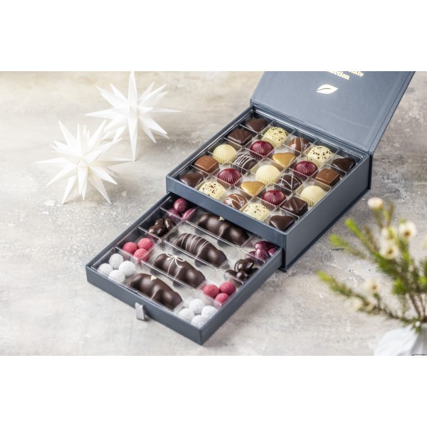 Smuk gaveæske med 25 fyldte chokolade med lækre smage som saltkaramel, lakrids, marcipan, citron, flødekaramel, appelsin, nougat, kahlua og rom karamel. I den “hemmelige” skuffe finder man 4 marcipangrise overtrukket med 70% mørk chokolade og hånddekoreret med hvid chokolade. Derudover et lækkert dragémix.