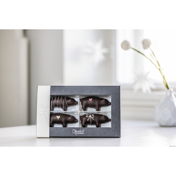 Marcipangrise med 52% mandler overtrukket med 70% mørk chokolade og hånddekoreret med hvid chokolade.