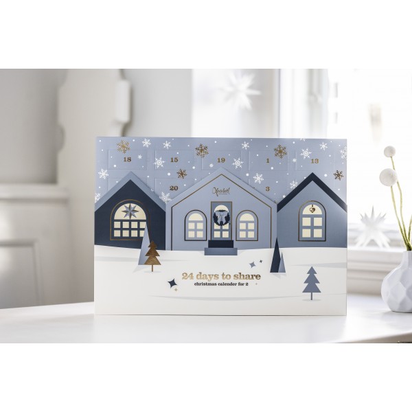 Julekalender til to personer eller dobbelt forkælelse til én selv. Kalenderen indeholder hele 24 forskellige varianter med 2 stk. fyldte chokolader bag hver låge. Dog med ekstra forkælelse d. 24. december hvor der er hele 4 fyldte stykker chokolader til at forsøde ventetiden.