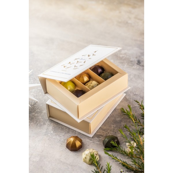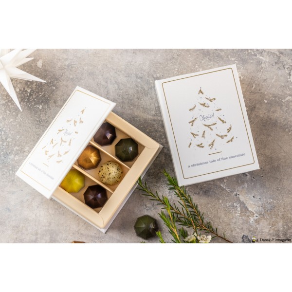 6 Fyldte chokolader med forskellige smagsvarianter med marcipan, lakrids, tom, blodapelsin, kahlua og