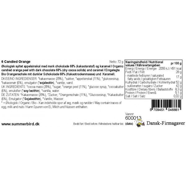 Kandiseret skal af solmodne økologiske appelsiner fra Spanien, overtrukket med et tykt lag mørk chokolade Arriba Nacional 68 % og knust karamel 6 stk. Indeholder 72 gr.