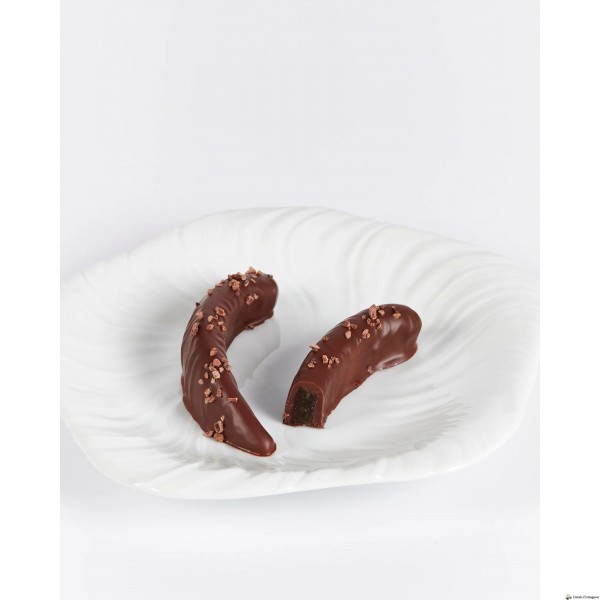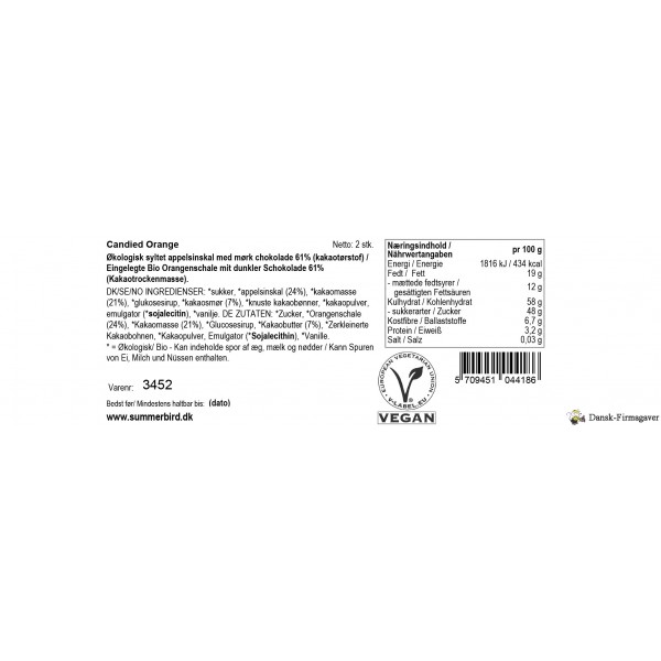 Kandiseret skal af solmodne økologiske appelsiner fra Spanien, overtrukket med et tykt lag mørk chokolade Arriba Nacional 68% og afslutningsvist drysset med let ristede knuste kakaobønner 16 stk. Indeholder 320 gr.