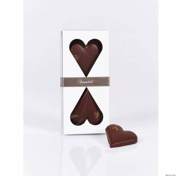 To klassiske hjerter af marcipan, lavet på stenvalsede middelhavsmandler, overtrukket med et tykt lag mørk chokolade Amazonas 61 % og drysset med let ristede knuste kakaobønner.