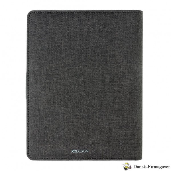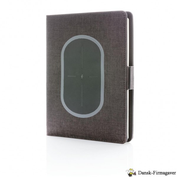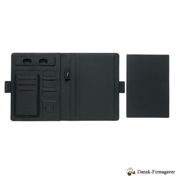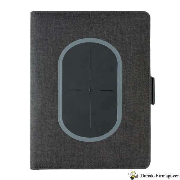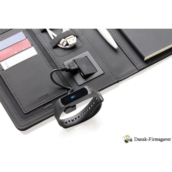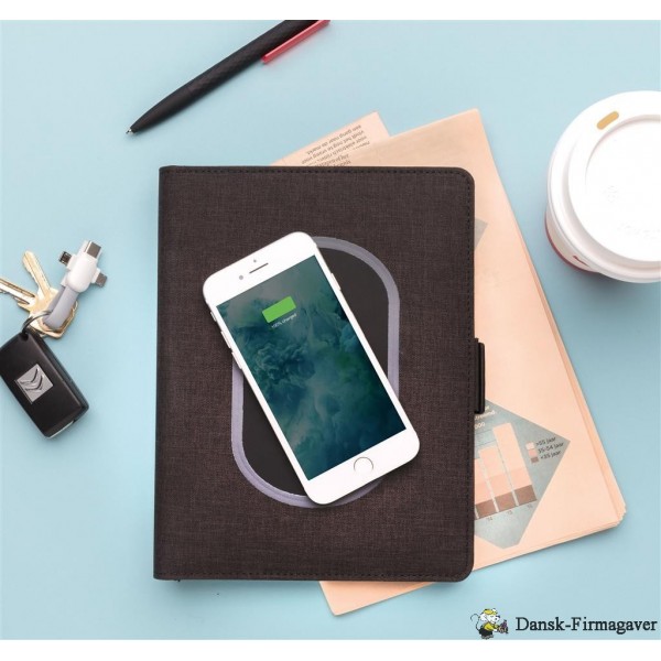 Denne portfolio med en 20 siders notesblok har den seneste teknologi. Omslaget på forsiden har en trådløs opladningspad til din telefon. (Android nyeste generationer, iPhone 8, 8S og X). Ældre telefoner og tablets kan oplades via USB-portene fra 4.000 mAh powerbanken. De unikke USB-porte kommer frem med et enkelt klik på en knap. Indgang: 5,0V/1,0A. Udgang: 5,0V/2,1A. Trådløs udgang: 5W. Registreret design®