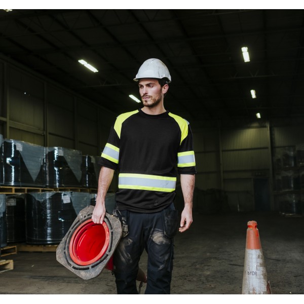 Pro-Dry behandlet unisex t-shirt med kontrastfelt i fluoriserende farve. Påsyede reflekser gør dig ekstra synlig i omgivelserne. Åndbart og fugttransporterende metervare som er meget behagelig mod huden. CE-mærket, EN ISO 13688, EN 1150.