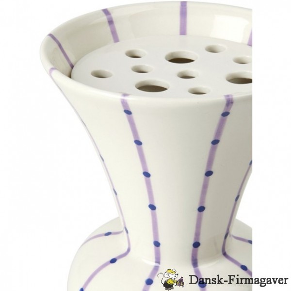 Med naturen som inspirationskilde er Signature en vase, der overrasker med sin grafiske fortolkning af blomster og frøstande med en keramikplade med huller placeret i vasens hals. Den lille Signature-vase måler 15 cm i højden og er dekoreret med lilla striber med prikker i en mørkere lilla nuance uden på vasen, hvor den tynde lilla stribe – nu uden prikker – ikke stopper ved vasens top, men fortsætter ned i vasen. Det giver et endnu flottere farvespil og tilfører vasen ekstra liv og bevægelse, at striberne ikke kun søger opad, men også fortsætter indvendig i vasen. Det ser ikke kun smukt ud, men giver også en helt ny dimension til designet, når formen fremhæves både indefra og udefra. Vasen er skabt af designduoen Meyer-Lavigne og lavet i stentøj – og som Kählers håndværksmæssige tradition foreskriver det, er vasen selvfølgelig håndmalet. Den bevidst overdrevne form giver vasen et afslappet look og skaber spræl i boligen, samtidig med at Signature-vasen fremstår unik og levende med en ganske særlig dynamik og autenticitet i udtrykket.