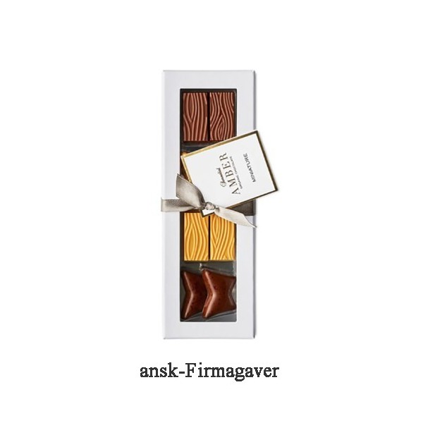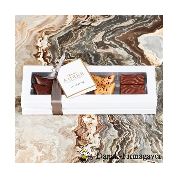 Amber Miniature-gaveæsken byder på en verden af velsmag i fire varianter. De små elegante stykker fyldte chokolader er alle omsluttet af vores forskellige Amber-varianter: Classic, Blond og Noir. Æsken byder på en verden af velsmag i form af f.eks. fleur d'orange praliné, vanilje, karamel, forfriskende mynte eller lakrids. Ganske enkelt den perfekte æske til dem, som sætter pris på harmoniske dekadente smagsoplevelser