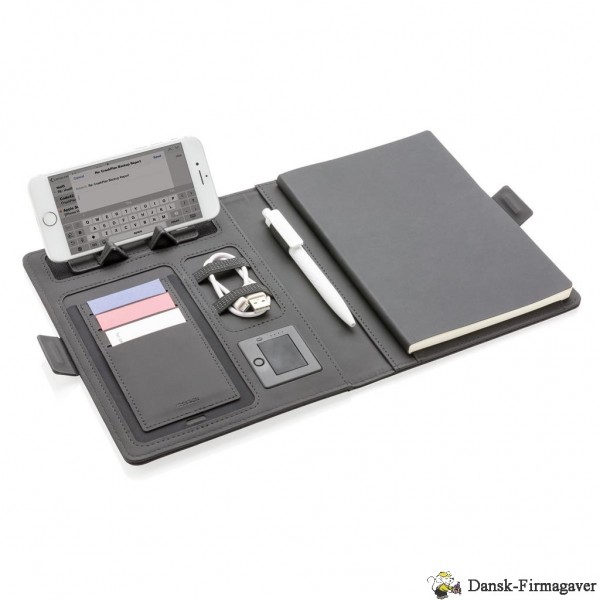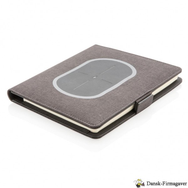 Dette omslag til notesbog med aftagelig notesbog (128 linjerede sider på 80 g/m2) har den seneste teknologi. Omslaget på forsiden har en trådløs opladningspad til din telefon. (Android nyeste generationer, iPhone 8, 8S og X). Ældre telefoner og tablets kan oplades via USB-portene fra 4.000 mAh powerbanken. De unikke USB-porte kommer frem med et enkelt klik på en knap. Indgang: 5,0V/1,0A. Udgang: 5,0V/2,1A. Trådløs udgang: 5W. Registreret design®